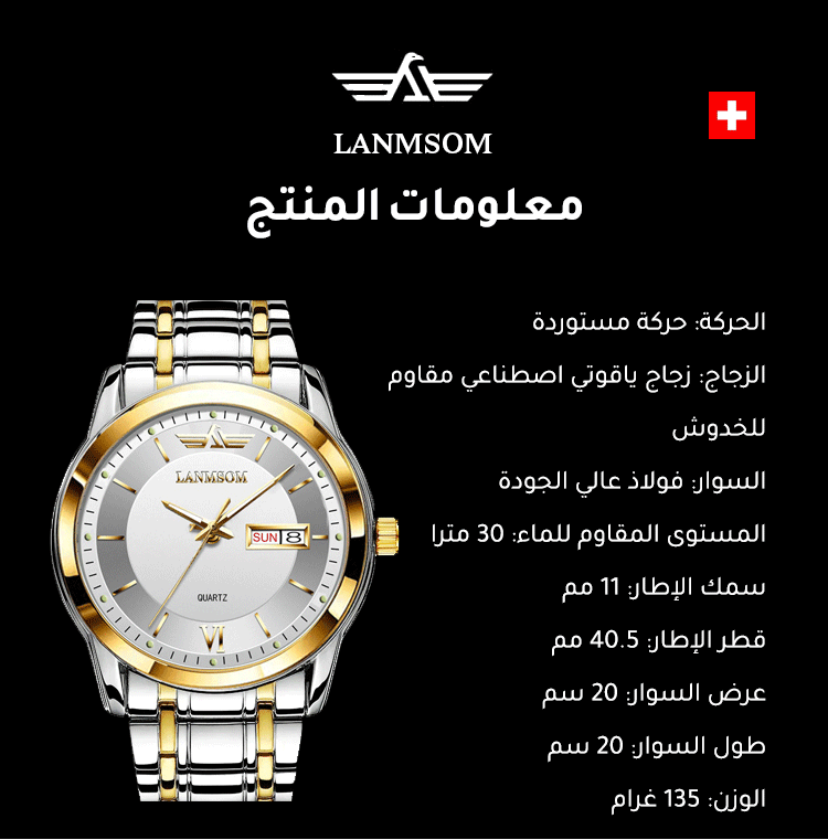 ساعة راقية ذات نافذة لعرض التاريخ واليوم من الماركة السويسرية LANMSOM
